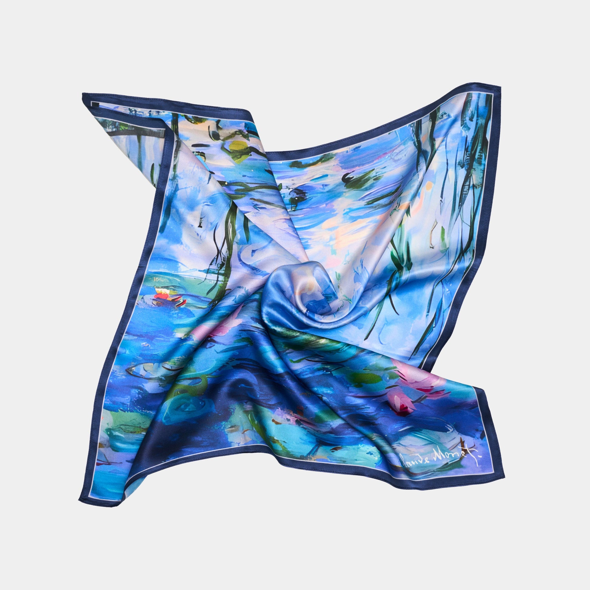 Claude Monet var impresjonismens mester, der blikket og penselen forvandlet øyeblikkets skjønnhet til en uendelig symfoni av farger. Verkene hans er en harmoni av lys og bevegelse, hvor naturens refleksjoner flimrer som et levende landskap – fylt med følelser og ro. Nå vekkes denne tidløse estetikken til live i luksuriøse silkeskjerf.