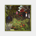 Henri Rousseau var en kunstner der virkelighet smelter sammen med fantasi. Hans drømmeaktige, naivistiske stil åpnet nye kunstneriske rom, hvor eksotiske planter, mystiske skikkelser og ville jungler pulserer av mystikk og harmoni. Dette er modernismens poesi – en invitasjon til drømmenes landskap, som vekkes til live i luksuriøse silkeskjerf.