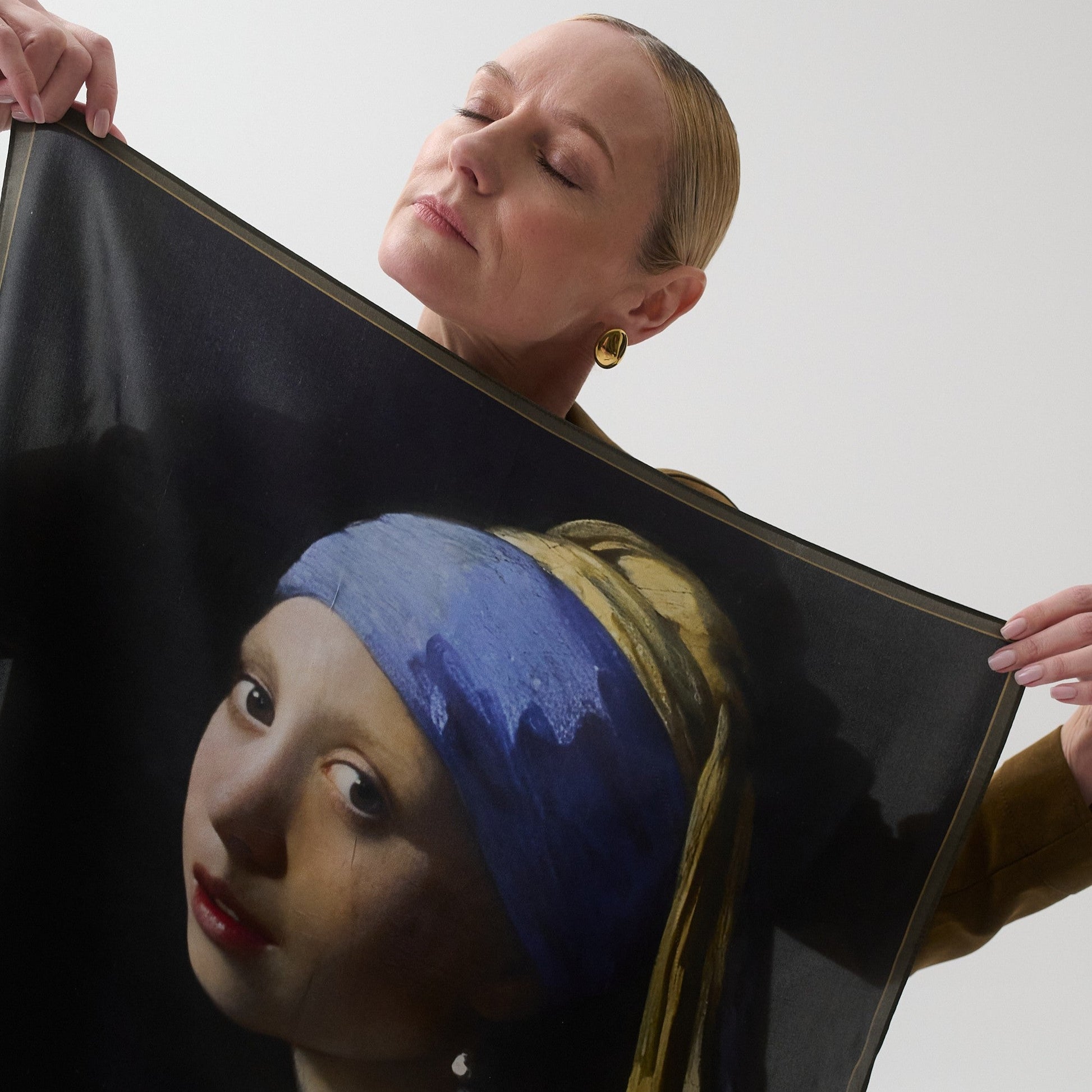 Designet på silkeskjerfet er basert på J. Vermeers maleri «Pike med perleøredobb». Olje på lerret. Nederland. 1665.