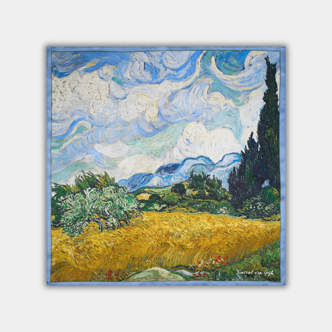 Designet på silkeskjerfet er basert på V.V. Goghs maleri "Hvetemark med sypresser". Olje på lerret. Frankrike. 1889.
